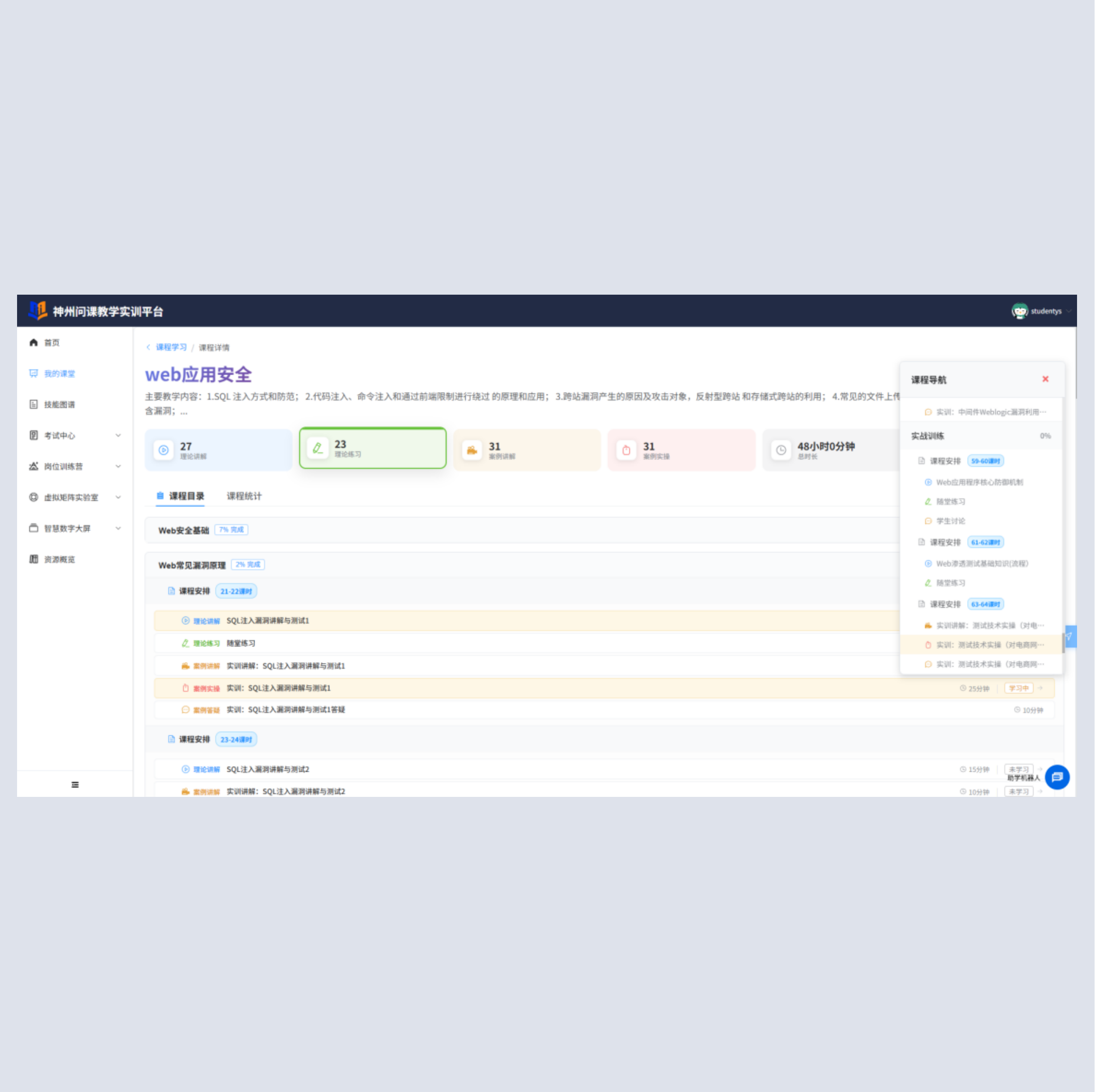 万象城AWC(中国)问课教学系统定义三个角色,教师、学生,管理员。具备课程中心,岗位训练营,理实一体化考试,开放式资源库等功能模块。支持模块化装载课程资源。课程中心模块给予课堂管理,我的课堂,课程引领,我的课程功能;理实一体化考试模块给予我的考试,试卷管理,考试管理功能。岗位训练营给予岗位测评,岗位报告,报告统计功能;开放式资源库给予理论题库,镜像管理,镜像模板管理,实训环境管理功能。 |